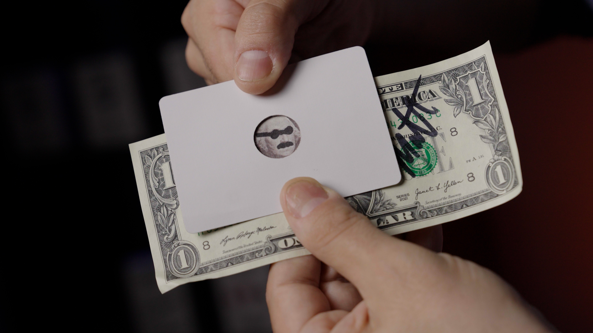 The HOLE CARD is place over the DOLLAR BILL showing George Washington's face. Without any COVER or MOVES you now proceed to SLIDE Georges head up to the TOP of the bill, then across to the RIGHT and then to the LEFT. Finally you you slide his head back onto his shoulders where it belongs. Immediately hand back the borrowed bill and show the card on BOTH sides.