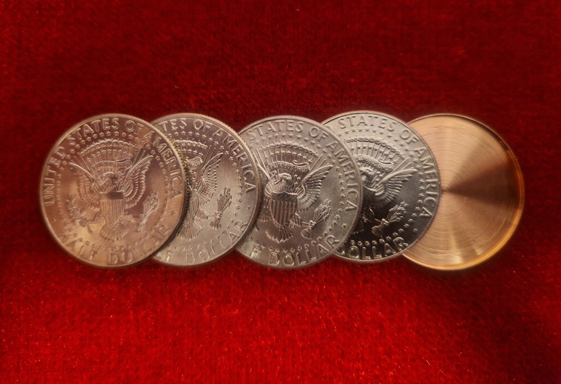These are matched sets of Kennedy Half Dollars. Each set consists of 4 regular halves and one true expanded shell that glides over ALL the coins in the set. Perfect for the classic matrix or coins across. These sets are individually measured so that all the coins are a perfect fit.