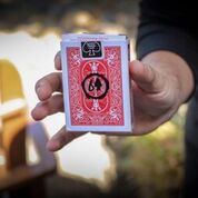 A circle is drawn on the cellophane of a card box. The circle is shown to your spectator. In this circle you draw one card; this card will be your SECRET PREDICTION. The deck is removed from the card case. The case is placed face down to one side.
