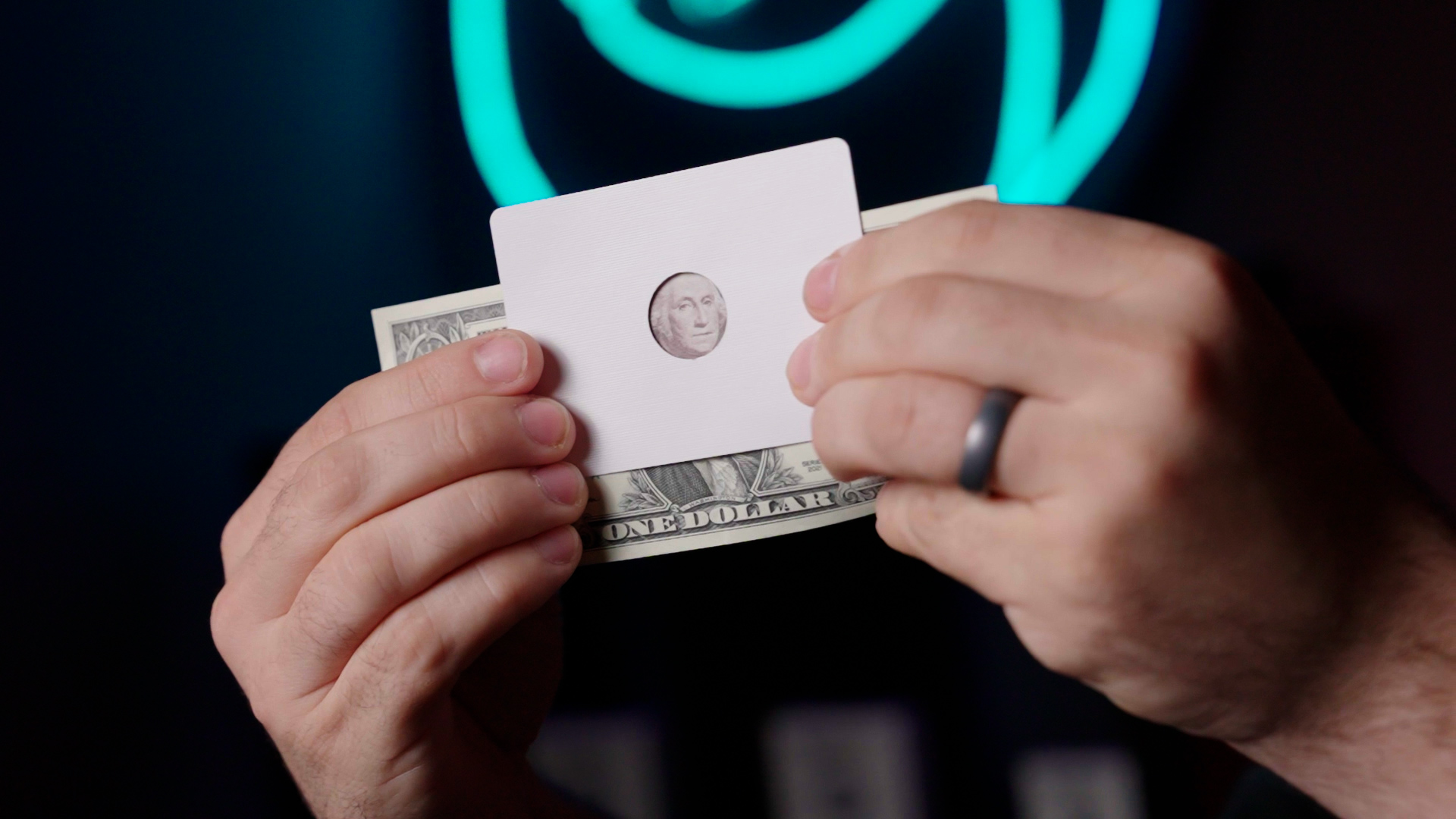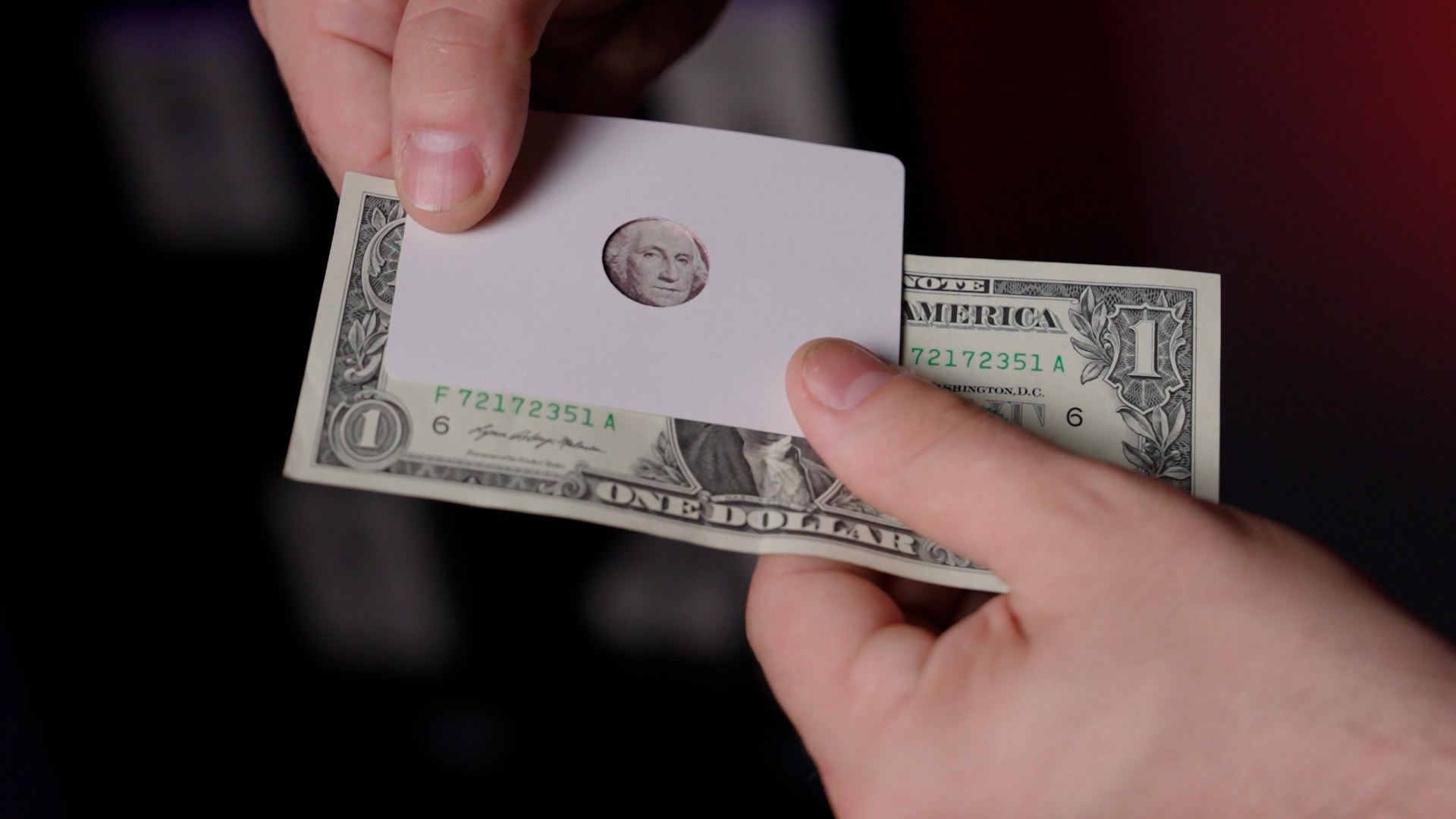 The HOLE CARD is place over the DOLLAR BILL showing George Washington's face. Without any COVER or MOVES you now proceed to SLIDE Georges head up to the TOP of the bill, then across to the RIGHT and then to the LEFT. Finally you you slide his head back onto his shoulders where it belongs. Immediately hand back the borrowed bill and show the card on BOTH sides.
